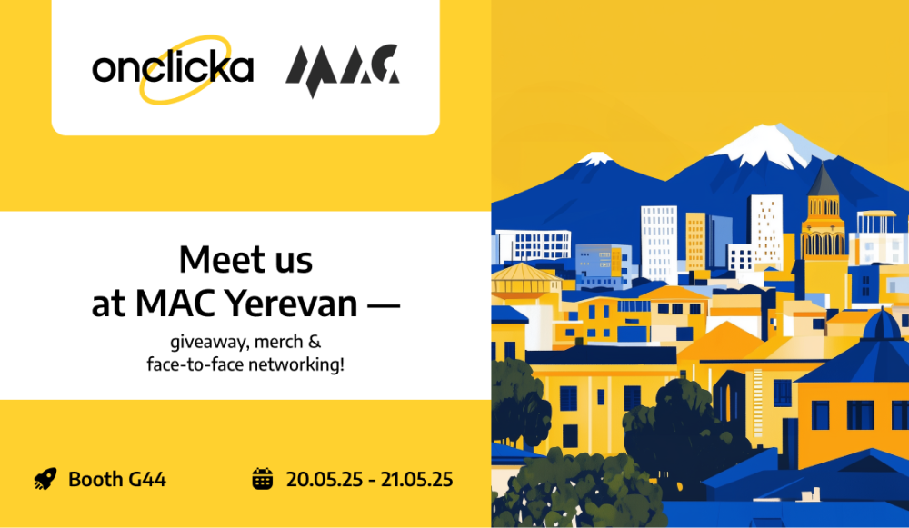 OnClickA at MAC Yerevan — come say hi! We’ll be at MAC Yerevan on May 20–21 — a great chance to meet in person, chat about traffic, campaigns, or just connect face to face. If you’re working with traffic (or looking for new ways to grow your project), you’ll definitely find something worth your time. What you’ll find at our booth: merch and giveaways a team ready to discuss formats, launches, or even your specific cases fun giveaways >Book a meeting < See you in Yerevan!