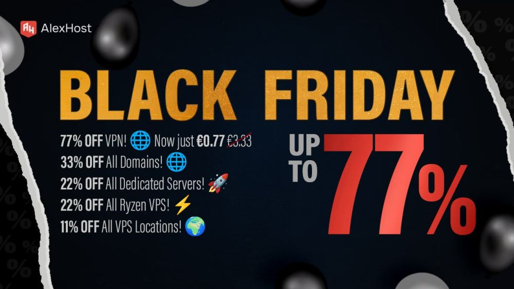 🥳 Black Friday Frenzy at AlexHost 😎 🛍 The season of savings is here, and AlexHost (http://alexhost.com/) is bringing you jaw-dropping discounts of up to 77% on premium hosting services 🎁 🥳 Whether you're a small business owner, a developer, or someone building the next big thing, we’ve got the perfect deal for YOU 🤡 💥 Unmissable Black Friday Discounts (https://alexhost.com/partnership/alexhost-launches-spectacular-discounts-up-to-77-heres-why-you-shouldnt-miss-out/): 🔒 VPN – 77🛍 Off. Secure browsing made affordable! Promocode: AHVPN 🌎 Domains – 33🛍 Off + FREE DNS Management. Build your brand with ease! Promocode: AHDOMAIN 🔑 SSL Certificates – 33🛍 Off. Lock in trust and security. Promocode: AHSSL ☄️ VPS Ryzen Plans – 22🛍 Off + FREE Admin Support. Speed meets value! Promocode: AHRYZEN 👑 Dedicated Servers – 22🛍 Off + FREE Migration Assistance. Power that scales with you. Promocode: AHDEDI 🌟 Shared Hosting/Litespeed – 22🛍 Off + FREE Setup. Perfect for growing sites! Promocode: AHHOSTING 🗺 All Location VPS – 11🛍 Off. Choose your server location for optimal performance. Promocode: AHVPS 🛍 Special Admin Offers Available! Get professional migration, setup, and admin support during this promotion. Create a ticket here 👉 AlexHost Support (https://bill.alexhost.com/tickets/new/) 🔴 ⏱ Don’t Wait – Start Saving Today! Black Friday deals like these don’t last forever! 🎉 Secure your hosting plan now and enjoy premium performance at unbeatable prices. -