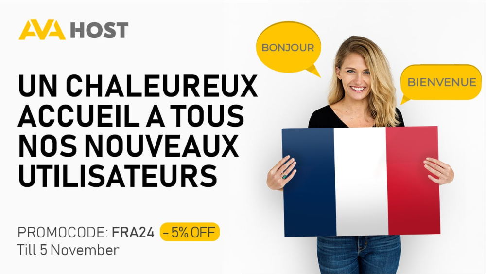 ๐ด Hello Friends, ๐ Exciting news! Our website is now live in French (http://ava.hosting/fr/)๐ซ๐ท, making it even easier for our French -speaking clients to connect with us. โค๏ธ A warm welcome to all our new usersโ Un chaleureux accueil ร tous nos nouveaux utilisateurs AvaHost! ๐ To celebrate, we're offering a 5% DISCOUNT, but act fastโthis special offer ends on 5 November! ๐ Simply use promo code FRA24 at checkout. Donโt miss your chance! ๐ก AvaHost (https://ava.hosting/news/avahost-now-available-in-french/)is committed to staying connected with our customers.