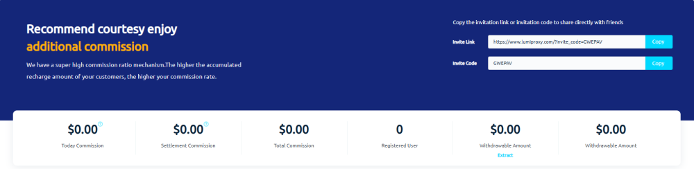 9. Affiliate program commission activity, up to 10%! 1️⃣ No need to recharge, just register. 2️⃣ After inviting users to register and purchase, 10% of the order amount will be directly used as your commission. 3️⃣ Supports redemption or direct withdrawal. Register to get your exclusive invitation code: https://www.lumiproxy.com/?invite_code=GWEPAV